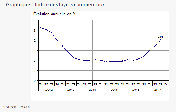 L’INSEE a publié ce jour l’indice des loyers commerciaux. Il ressort en hausse au 3e trimestre 2017 de +2.04% en rythme annuel.