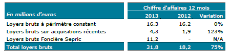 Au cours de l’année 2013, les loyers bruts totaux du portefeuille immobilier en exploitation se sont élevés à 31,8 millions d’euros, en augmentation de 75% par rapport à l’exercice 2012.